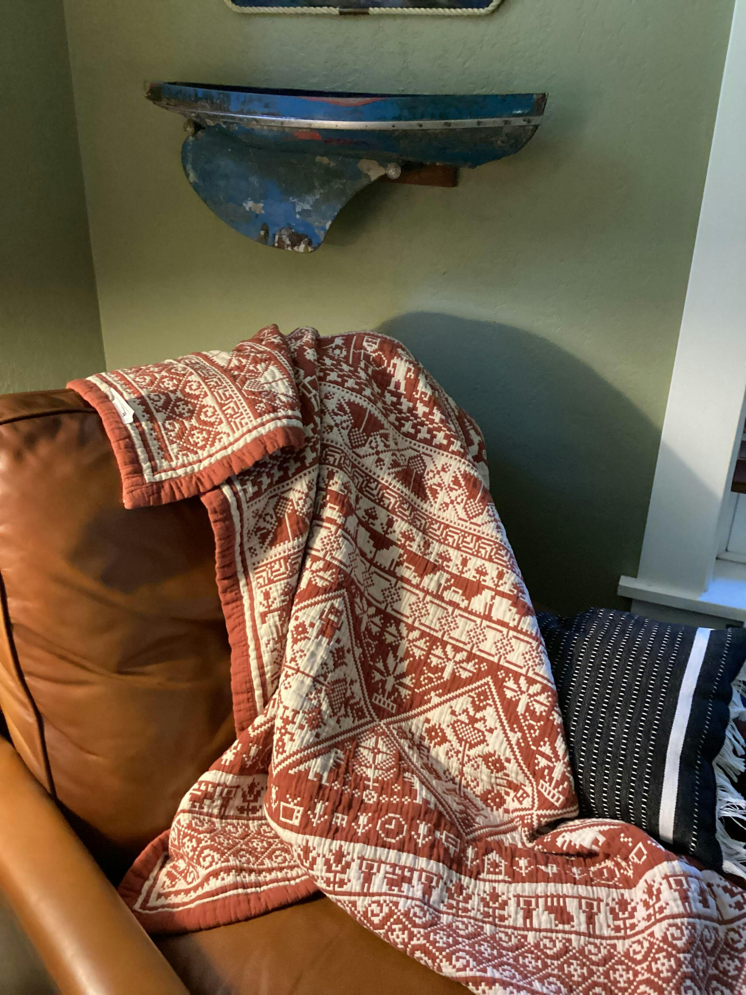 Discombobulated timelines are the theme of Don Moyer's old-fashioned-looking cotton throw. The design is an homage to traditional textiles (quilting, needlepoint, and embroidery) with the added thrill of mammoths and space ships, a hint of vintage video games, and more surprises. All in a cozy, warm, terra cotta and cream combo.