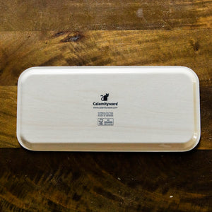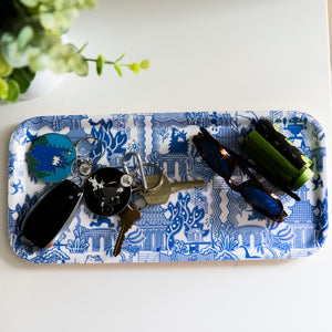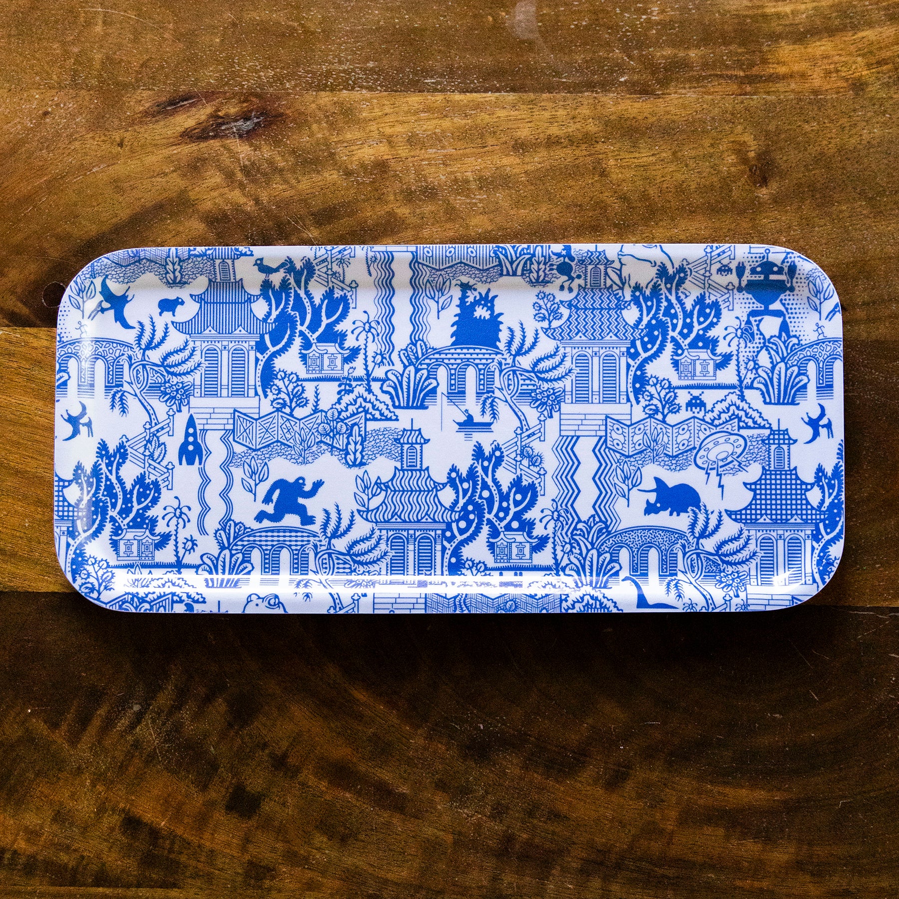 Small trays made from birchwood coated with melamine, decorated with a traditional blue-willow paradise discombobulated by more than a dozen calamities, perils, and pests that graciously remind you things could be much worse.