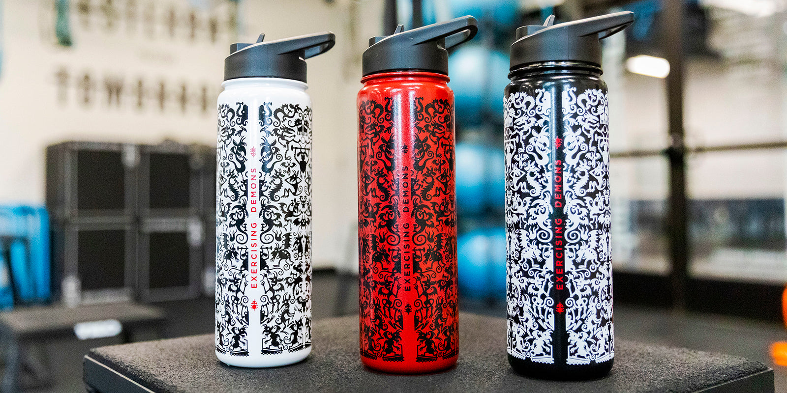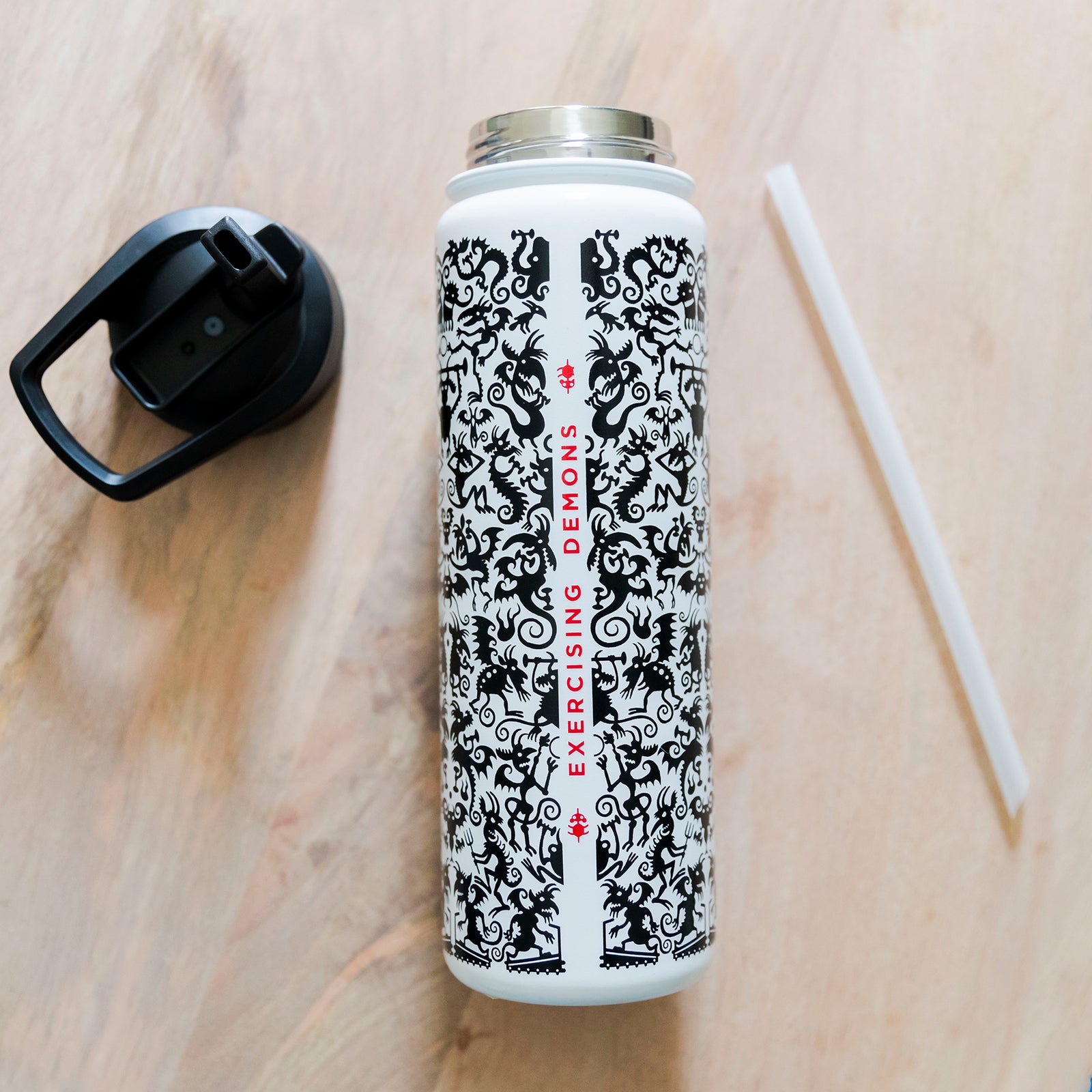 Sturdy, insulated, stainless steel water bottles decorated with a dignified pattern of demons engaged in wholesome exercise. Screw-on plastic top won’t leak when you tip it over on your desk or toss it into your gym bag.