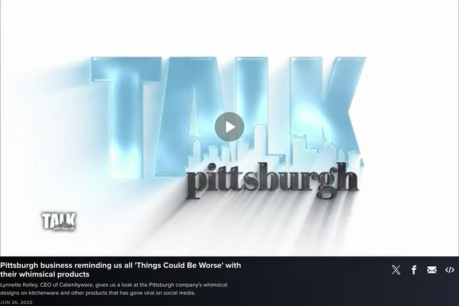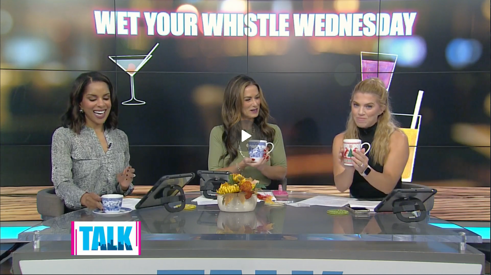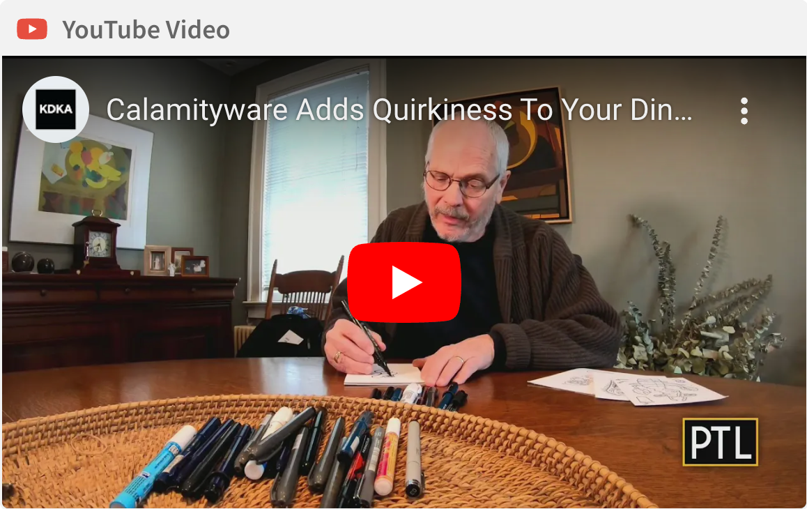 In October 2024, Pittsburgh Talk (an afternoon talk show) featured our Calamityware mugs during their Wet Your Whistle Wednesday segment. Left to right, the Things Could Be Worse teacup and saucer, the 20 ounce Things Could Be Worse mug, and the Creature Comfort holiday mug. (Click the photo to watch the segment.)